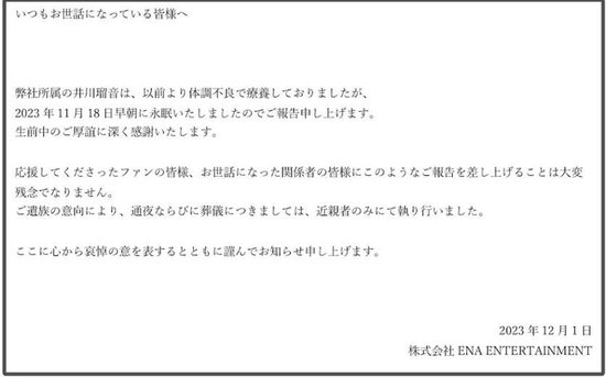 声明中写道,井川瑠音因身体状况不佳休息调整后,于2023年11月18日清晨永眠,感谢大家生前的关照。根据家属意见,守灵和葬礼都只有近亲属参加。