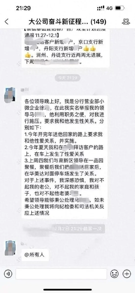 截图显示,该群是149人的工作群,在12月2日晚9点多钟,一位头像是女性的徐姓员工,在群里发了一段文字,自称是分行营业部员工,实名举报她的领导马某某利用职务之便,对她进行施压。