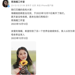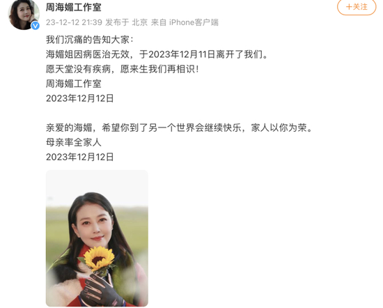 12月12日,晚9点,周海媚工作室发文,称周海媚因医治无效,于2023年12月11日离世。