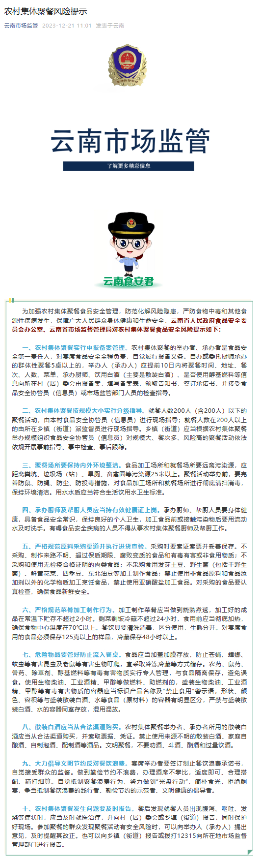 据云南市场监管微信公众号近日消息:为加强农村集体聚餐食品安全管理,防范化解风险隐患,严防食物中毒和其他食源性疾病发生,保障广大人民群众身体健康和生命安全,云南省人民政府食品安全委员会办公室、云南省市场监督管理局对农村集体聚餐食品安全风险提示如下: