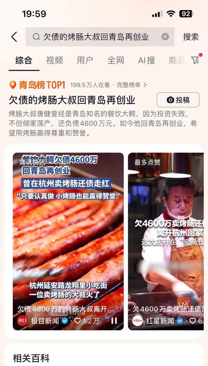 12月29日,欠债的烤肠大叔回青岛再创业登上某短视频平台青岛榜的top1,烤肠大叔再次成为网络关注的焦点。公众第一次听说烤肠大叔唐健还是在2022年的下半年,那一年,唐健在杭州延安路上的龙翔里小吃街卖烤肠还4600万元债务的视频火了。后来有人认出了这位视频中卖烤肠还债的人正是在青岛创立了唐家老院子、大唐渔宴、朗园等知名餐饮企业在青岛餐饮界很有名气的唐健。