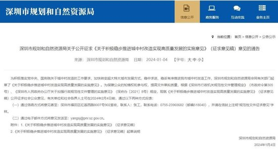 1月4日,由深圳市规划和自然资源局会同深圳市住房和建设局起草的《关于积极稳步推进城中村改造实现高质量发展的实施意见》(征求意见稿)(以下简称《意见》)发布,于2024年2月4日前向社会征求意见。