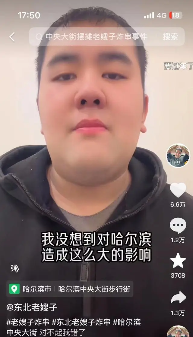 日前,在哈尔滨中央大街摆摊卖炸串的博主“东北老嫂子”发布道歉视频,称自己不该冲动。