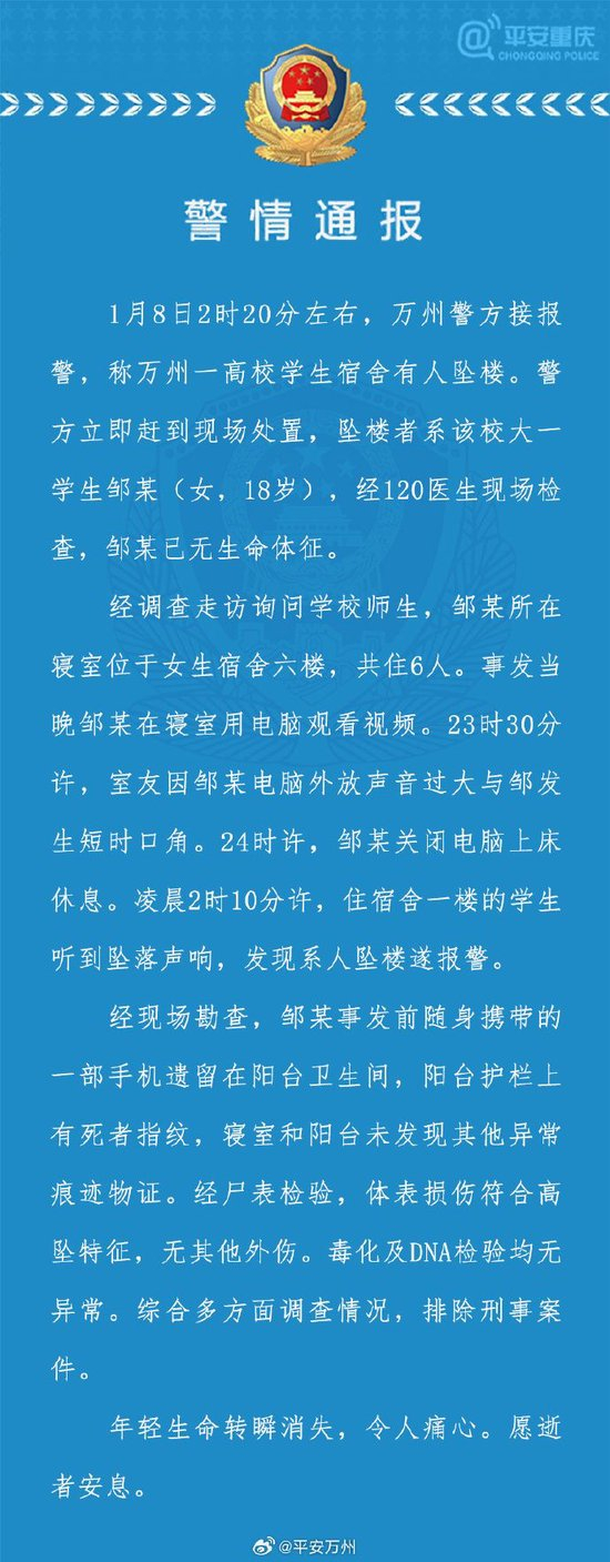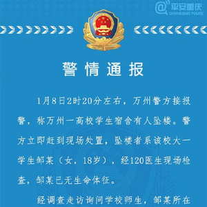 重庆市万州区公安局官方微博1月12日通报,1月8日2时20分左右,万州警方接报警,称万州一高校学生宿舍有人坠楼。警方立即赶到现场处置,坠楼者系该校大一学生邹某(女,18岁),经120医生现场检查,邹某已无生命体征。综合多方面调查情况,排除刑事案件。