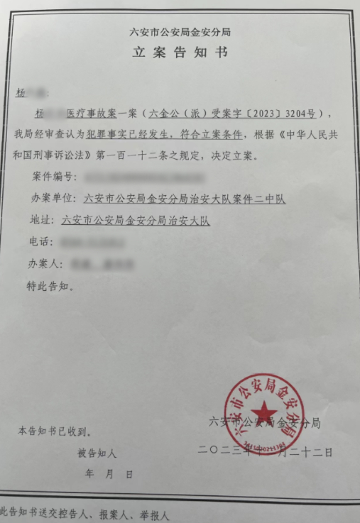 12月22日,六安市公安局金安分局的一份立案告知书称,杨开平医疗事故案,“我局经审查认为犯罪事实已经发生,符合立案条件,根据相关规定,决定立案。”