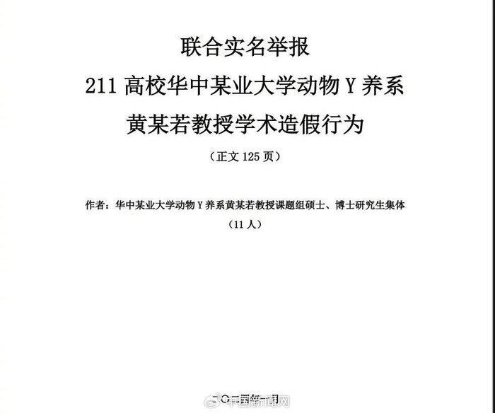国是直通车获取了这份举报信的PDF文件。举报信名为《联合实名举报211高校华中某业大学动物Y养系黄某若教授学术造假行为》,署名作者为“华中某业大学动物Y养系黄某若教授课题组硕士、博士研究生集体(11人)”。举报信全文共计3.3万余字、图片十余张,设前言、博士、硕士、黄教授其余行为总览、讨论、结语、致谢共7个章节,格式如同一篇论文。