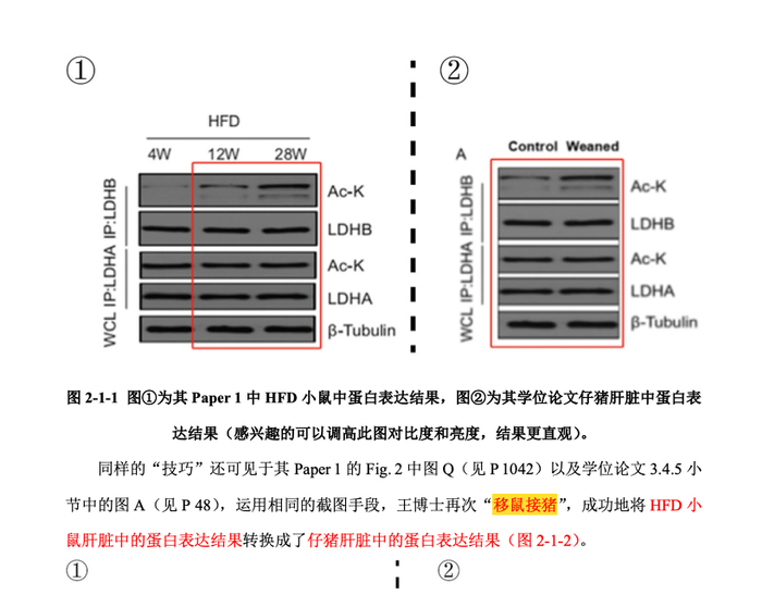 举报信称,黄某某指导的一名博士生先后发表的两篇论文中,多处数据“移鼠接猪”。使用鼠和猪两种不同实验对象,在不同阶段或通过不同处理方式得出的实验结果却仍然相同。信中列举的证据显示,类似造假行为至少有数十例。