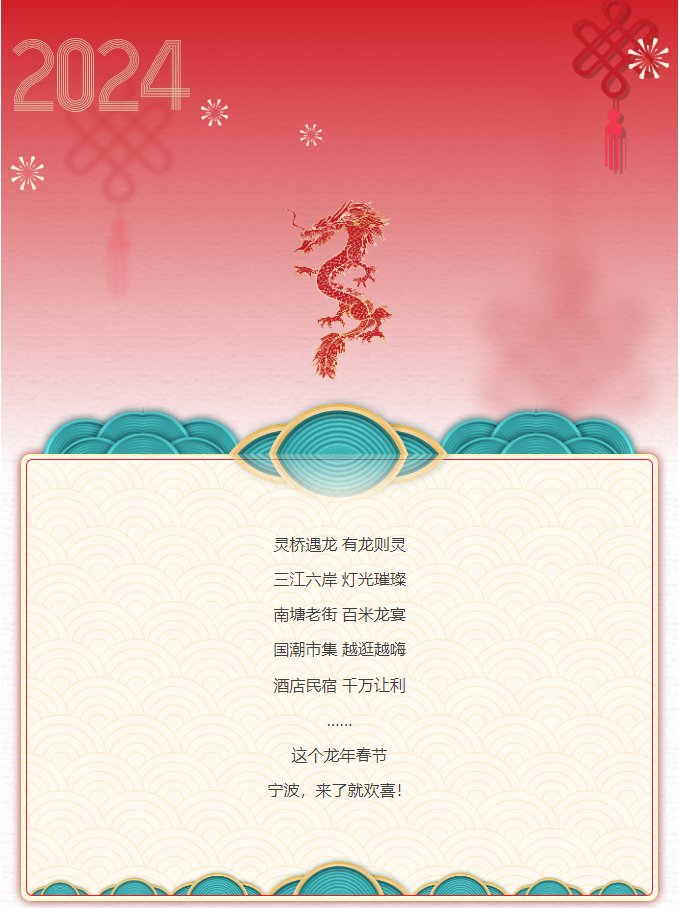 新春将至,宁波文旅推出“龍好·宁波——2024宁波文旅‘十龙闹春’过大年”,奉上十大系列、百场好戏、千项活动,邀请广大市民游客在宁波过一个有戏可看、有景可逛、欢乐可品、幸福可感的吉祥团圆年。