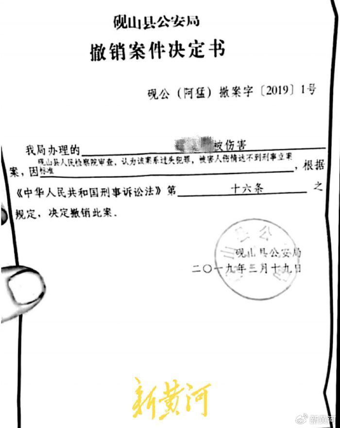 2019年3月19日,砚山县公安局决定撤销此案。根据砚山县公安局当时出具的《砚山县公安局决定撤销案件同意书》显示:经砚山县人民检察院审查,认为该案系过失犯罪,被害人伤情达不到刑事立案标准,根据《中华人民共和国刑事诉讼法》第十六条规定,决定撤销此案。