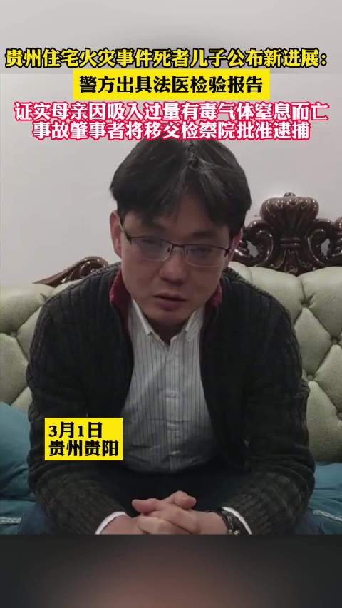 [#贵州住宅火灾事件死者儿子公布3个新进展#]3月1日,贵州贵阳,备受关注的贵州住宅火灾事件死者儿子公布事件最新进展:1、法医鉴定报告显示,母亲是因吸入过量有毒气体窒息而亡;2、因放烟花导致火灾事故的肇事者将移送检察院申请批准逮捕,后面会进行刑事诉讼。物业、房开和涉及到的其他部门的责任,要等到事故的综合调查报告出来之后,才能往前推进。3、小区消防设施的整改年后已复工,正在进行中。他坦言,最近压力很大。也非常感谢大家持续的关注和支持。1月30日,贵阳一小区烟花爆炸致居民家中起火,现场1名老人抢救无效死亡。悲剧发生后,去世老人儿子怒斥小区消防栓成“摆设”,事件引起全网关注。