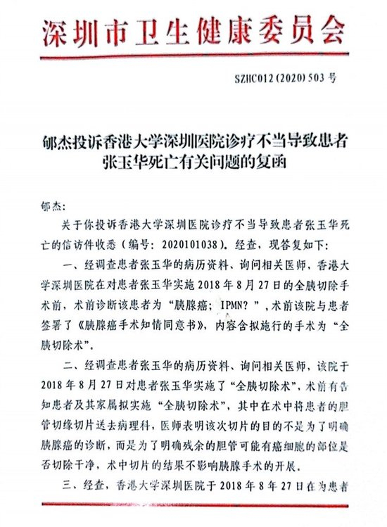 根据郇杰提供的深圳卫健委出具的《郇杰投诉香港大学深圳医院诊疗不当导致患者张玉华死亡有关问题的复函》,深圳卫健委表示,2018年8月27日对患者张玉华实施全胰切除术前,医院与患者签署了《胰腺癌手术之情同意书》,内容含拟施行的手术为“全胰切除术”。