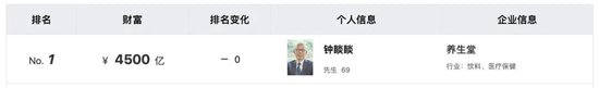 此后,钟稳坐胡润百富榜中国首富。《2023胡润百富榜》上,他以4500亿元身家,第三次登顶。