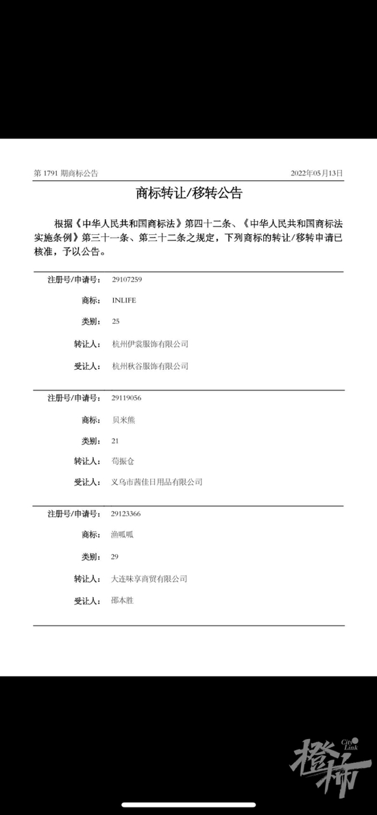 2022年5月杭州伊裳服饰有限公司把inlife品牌转让给杭州秋谷服饰有限公司。天眼查显示,杭州伊裳服饰有限公司的大股东为李燕飞,杭州秋谷服饰有限公司的两个股东叫李燕龙、李燕波。