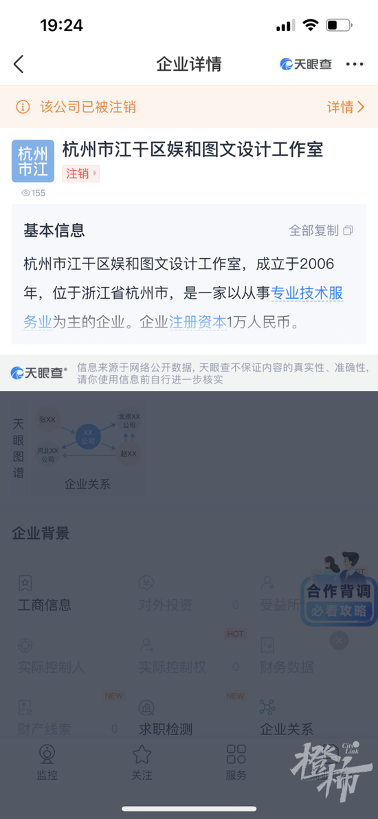 伊裳服饰有限公司法定代表人是朱华水,2006年他曾成立杭州市江干区娱和图文设计工作室,目前的经营状态为注销。2014年朱华水还成立了衣纳芙服装有限公司,天眼查显示2017年该公司已注销。