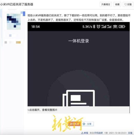 记者检索发现,2021年12月6日,就有网友在社交平台发帖称:“现在小米VR服务器已经关闭了,除了下载好的一些应用可以用,别的都不行了,那些登录不上去的,不是机器坏了,是服务器关了,还有现在千万别恢复出厂设置,会直接成‘砖’。”然而,记者并未找到相应的官方通知,仅在小米社区看到小米VR正式版运营团队于2019年6月28日发布的一则《关于小米VR正式版部分机型无法使用公告》。其中提到,“由于安卓最新系统限制原因,导致两款机型小米mix2、小米6安卓P版本MIUI无法运行及更新支持,最终不得不做出小米VR正式版对这两款机型停止运营的决定!其他四款机型小米5S、小米5sPlus、小米note2、小米5可正常使用。”
