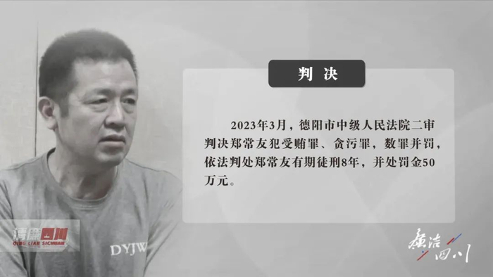 2023年3月,德阳市中级人民法院二审判决郑常友犯受贿罪、贪污罪,数罪并罚,依法判处郑常友有期徒刑8年,并处罚金50万元。