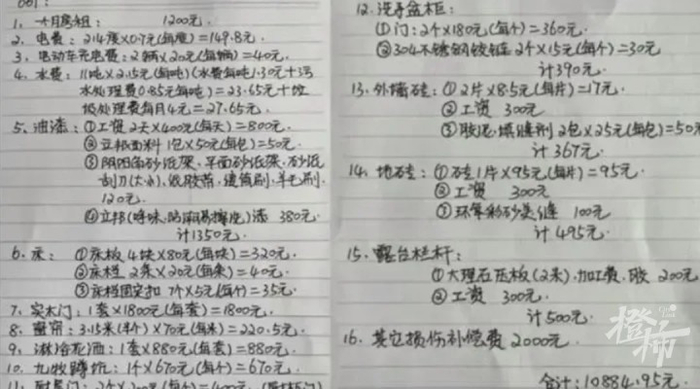 之后详细列出一张16项清单:除房租和水、电费外,床、实木门、窗帘、花洒、蹲坑、厨房门、外墙砖、地砖……床板需要更换4块,每块80元一共320元;淋浴花洒需要更换1套,单价880元……最后还有一笔2000元的“其他损伤补偿费”,赔偿款合计10884.95元。