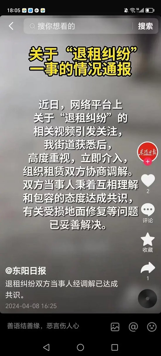 8日18时,东阳市政府新闻办工作人员告诉新黄河记者,官方通报已发。新黄河记者发现,东阳市江北街道办事处16:25发布了官方通报:“近日,网络平台上关于‘退租纠纷’的相关视频引发关注,我街道获悉后高度重视,立即介入,组织租赁双方协商调解。双方当事人秉着互相理解和包容的态度达成共识,有关受损地面修复等问题已经妥善解决。衷心感谢社会各界对我们工作的关心和支持。我们将继续努力,为市场主体提供更公平、有序、和谐的发展环境。”(新黄河)