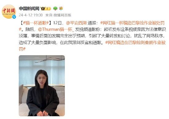 12日,@平安西湖 通报:网红猫一杯编造巴黎捡作业被处罚。随后,@Thurman猫一杯_ 发视频道歉称:起初发布这条视频是因为法律意识淡薄,事情后面的发展完全出乎预期,引起了大量转发和讨论,扰乱了网络秩序,造成了大量负面影响,在此我深刻反省和道歉。