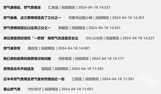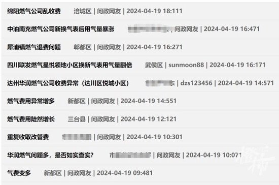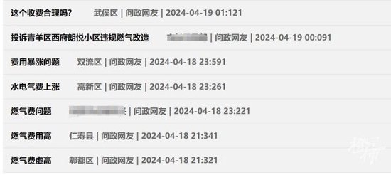橙柿互动记者在四川问政公开平台上发现,成都市民反映燃气收费问题的投诉意见不少,涵盖了成都锦江区、高新区、青羊区、郫都区等,此外四川绵阳、南充、广安、自贡、内江等地也有相关问题反映。