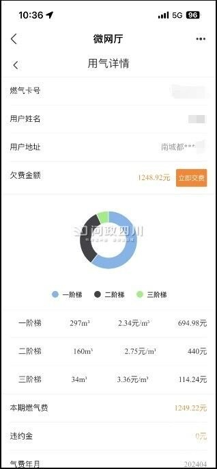 成都市高新区南城都汇2A期汇雅园一住户说,他们家燃气账单高达1691.76元,4月燃气暴涨后,直接到了第三阶梯。该住户说,他们家从2021年-2024年2月每月燃气费均非常的低,经常出现10立方米以内的用量。