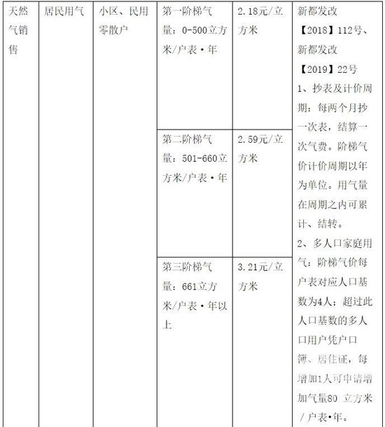 上述区域的燃气供气企业为成都燃气集团股份有限公司(下称:成都燃气),按“成都燃气”官网显示,三个阶梯用量每户表每年为:1-500立方米为第一阶梯,501-660立方米为第二阶梯,661以上立方米为第三阶梯。此外,该公司还给安装暖气客户从前一年12月到次年2月增加1200立方米用量。