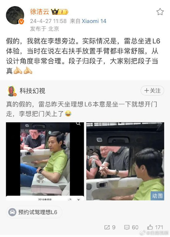 4月27日,小米高管徐洁云转发“真的假的,雷总昨天坐理想L6本意是坐一下就想开门走,李想把门关上了”的微博并辟谣:假的,我就在李想旁边。实际情况是,雷总坐进L6体验,当时在说左右扶手放置手臂都非常舒服,从设计角度非常合理。段子归段子,大家别把段子当真。