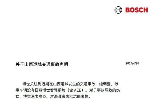 28日,博世针对问界M7山西运城事故发布声明:经调查,涉事车辆没有搭载博世智驾系统(含AEB)。对于事故导致的伤亡,博世深表痛心,对遇难者表示沉痛哀悼。