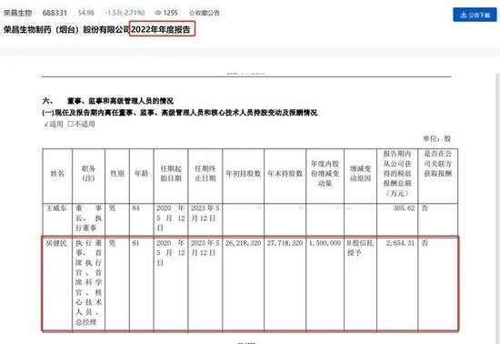 荣昌生物总经理、CEO房健民2022年的薪酬是2654万元,首席医学官何如意2022年的薪酬是2604万元。2023年,两人的薪酬分别降至814万元和772万元,降幅分别为69.33%和70.35%,均达到七成左右。