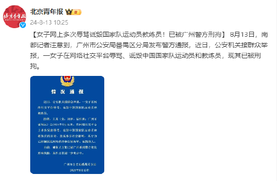[女子网上多次辱骂诋毁国家队运动员教练员!已被广州警方刑拘] 8月13日,南都记者注意到,广州市公安局番禺区分局发布警方通报,近日,公安机关接群众举报,一女子在网络社交平台辱骂、诋毁中国国家队运动员和教练员,现其已被刑拘。