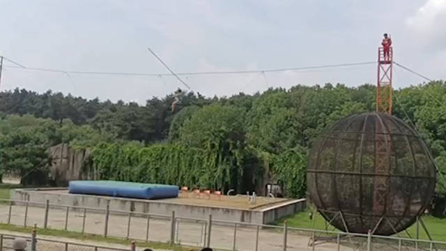 8月18日,在吉林长春东北虎园,一杂技演员高空走钢丝表演时,从空中坠落地面。