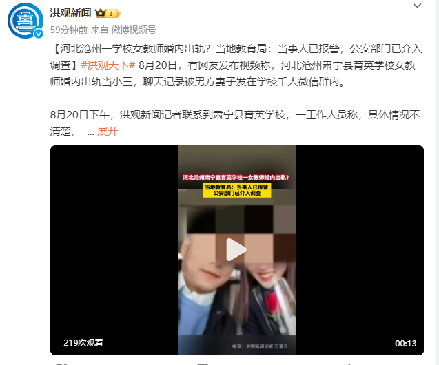 [河北沧州一学校女教师婚内出轨?当地教育局:当事人已报警,公安部门已介入调查]8月20日,有网友发布视频称,河北沧州肃宁县育英学校女教师婚内出轨当小三,聊天记录被男方妻子发在学校千人微信群内。