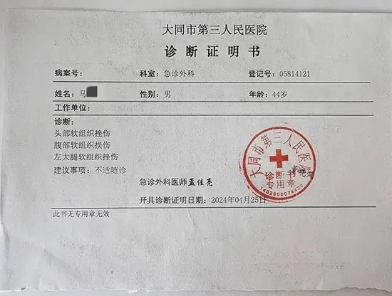 医院诊断证明显示,马先生头部软组织挫伤,腹部软组织损伤,左大腿软组织挫伤,医生建议不适随诊。