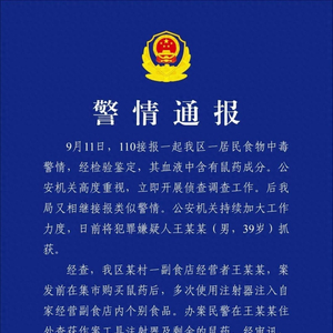 9月29日,天津市公安局蓟州分局发布警情通报称:9月11日,110接报一起我区一居民食物中毒警情,经检验鉴定,其血液中含有鼠药成分。公安机关高度重视,立即开展侦查调查工作。后我局又相继接报类似警情。公安机关持续加大工作力度,日前将犯罪嫌疑人王某某(男,39岁)抓获。
