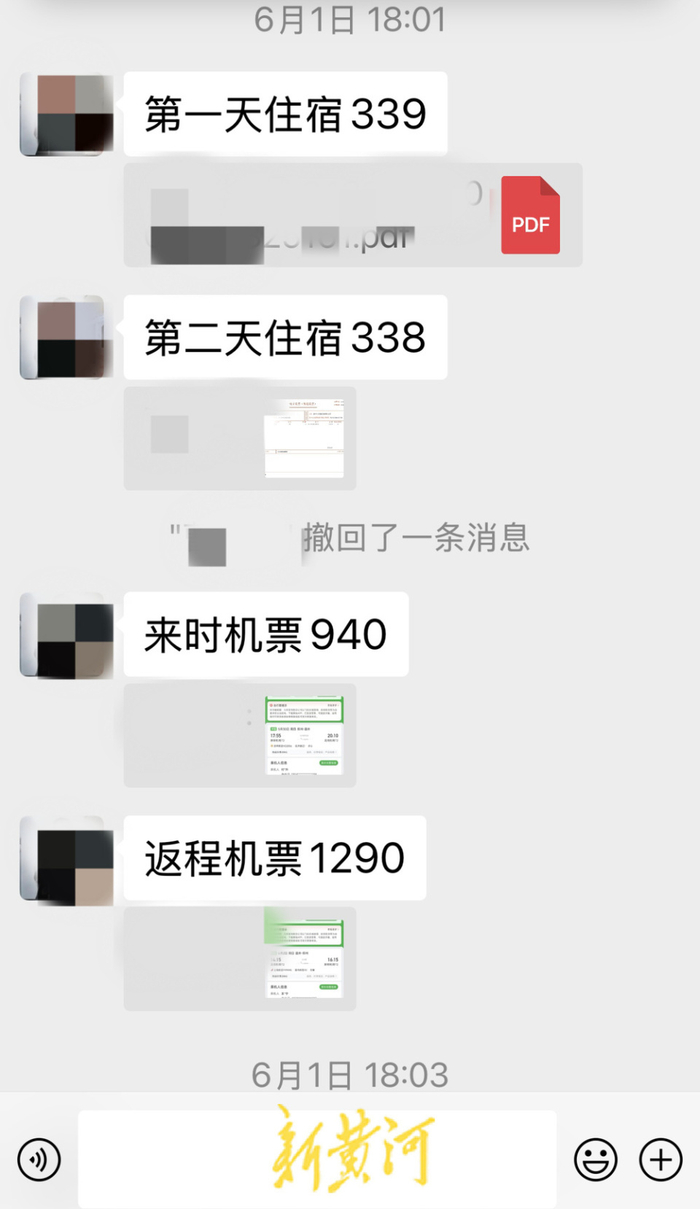 根据项先生提供的多张微信截图及转账截图显示,一人自称是河南省濮阳市公安局华龙区分局的警察付某,在和项先生母亲的微信交流中,相继向对方发出了自己的住宿发票、往返机票截图及自己的人民警察证照片等,并清楚写明“第一天住宿339元”“第二天住宿338元”“来时机票940元”“返程机票1290元”,合计2907元。此后项先生母亲向对方转账3000元。“更让我无法理解的是,对方拿的发票抬头是他们单位的名字,我是不是可以理解,他们回去后还会重新再报销一次?”项先生说道。
