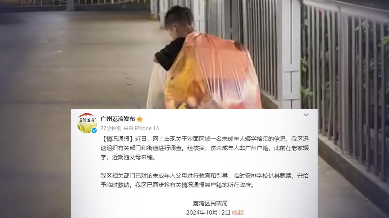 据广州市荔湾区融媒体中心官方微博,10月12日,荔湾区民政局通报称,近日,网上出现关于沙面区域一名未成年人辍学拾荒的信息,荔湾区迅速组织有关部门和街道进行调查。经核实,该未成年人非广州户籍,此前在老家辍学,近期随父母来穗。