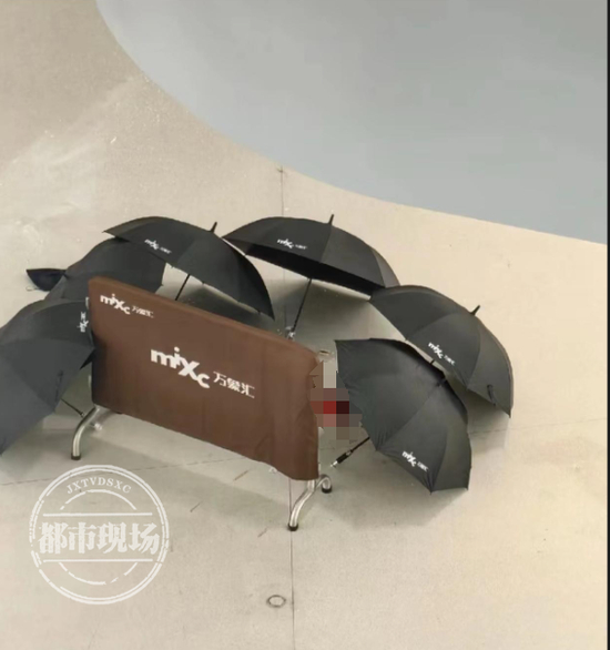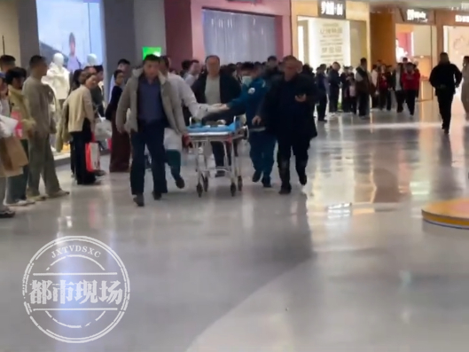 疑似女孩的家长在现场瘫坐在地,有商场工作人员在场处理,随后,女孩被紧急送医抢救。