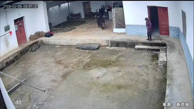 从监控画面可以看到,野猪袭击老人的事情发生在24日上午9点过,老人听到院子里的声响,从屋内走出与野猪在门口相遇,野猪突然撞向老人,并对老人进行撕咬,老人从台阶摔到地上。视频中,有三条狗在周围狂叫,但并未成功阻止野猪。