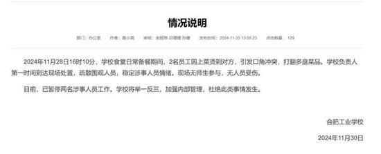 另据该校官方发布的情况说明,2024年11月28日16时10分,学校食堂日常备餐期间,2名员工因上菜烫到对方,引发口角冲突,打翻多盘菜品。学校负责人第一时间到达现场处置,疏散围观人员,稳定涉事人员情绪。现场无师生参与,无人员受伤。目前,已暂停两名涉事人员工作。