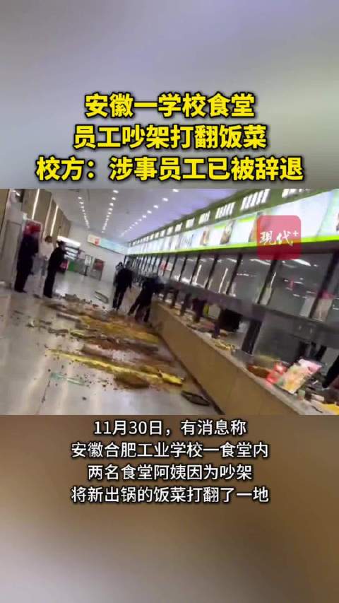 有网友称,上述情况系食堂工作人员突发矛盾所致。极目新闻记者拨打合肥工业学校的食堂管理监督投诉电话,接线人员称,涉事人员已被辞退。