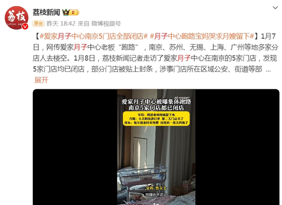 据荔枝新闻报道,1月8日,记者走访了爱家月子中心在南京的5家门店,发现5家门店均已闭店,部分门店被贴上封条,涉事门店所在区域公安、街道等部门正联合处理,登记人员信息。此外,5家门店均涉及拖欠员工薪资、拖欠房租、定金无法退还等问题。