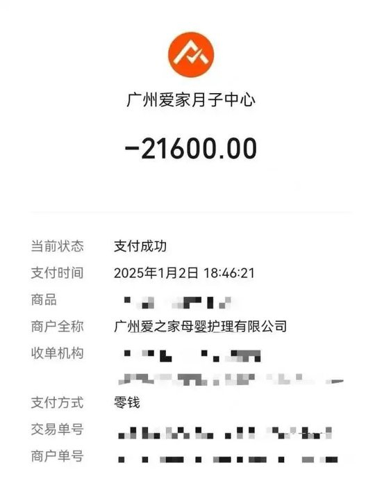 另据极目新闻报道,1月8日,上海的王先生告诉记者,他妻子的预产期在2025年7月,因为之前有朋友住过爱家月子中心,且该品牌口碑不错,他们准备选择该品牌在上海浦东新区的一家门店。2024年12月底,夫妻俩看到品牌方工作人员发布“涨价通知”的信息,到门店实地看过后,于2024年12月31日付了款,28天的服务期,总价是2.36万元。他妻子原本计划2025年7月住进月子中心。然而,1月7日,门店销售人员在朋友圈公开发布动态,他们才得知门店闭店了。