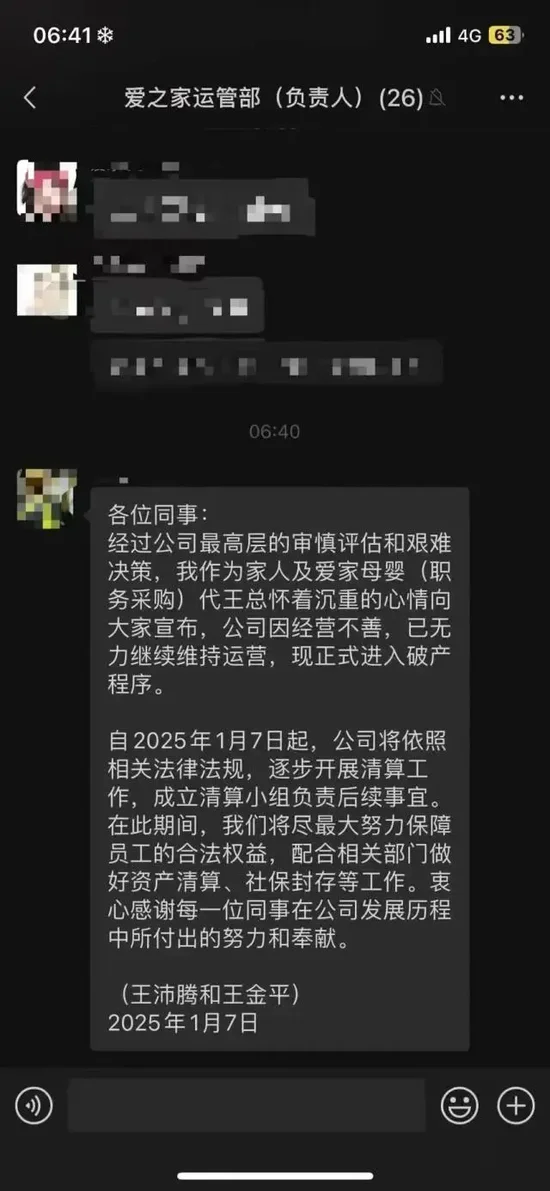 落款为“王沛腾和王金平”的一则群消息说:“经过公司最高层的审慎评估和艰难决策,我作为家人及爱家母婴(职务采购)代王总怀着沉重的心情向大家宣布,公司因经营不善,已无力继续维持运营,现正式进入破产程序。”