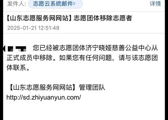 另据2025年1月21日中午12时51分的邮箱信息显示,您已经被志愿团体济宁晓娅慈善公益中心从正式成员中移除。