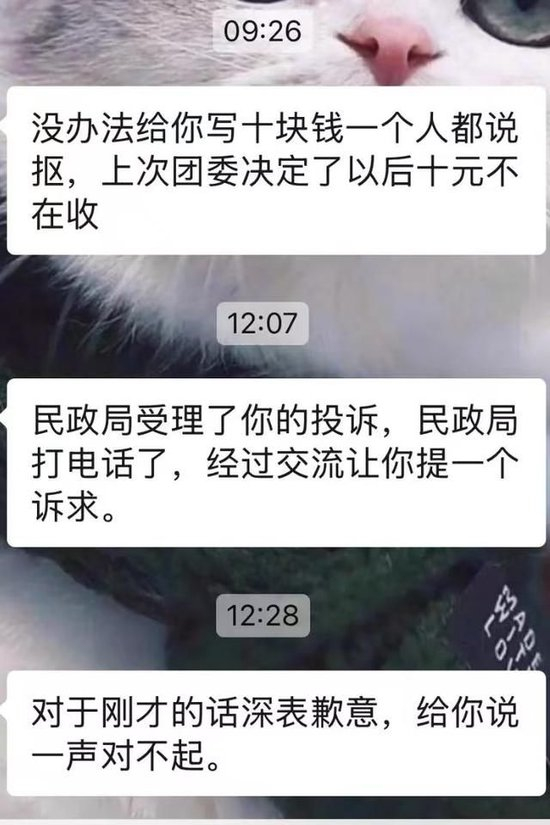聊天记录中显示,中午12时许,陈某某回复道,“民政局受理了你的投诉,打电话了,经过交流让你提一个诉求。”又过20分钟,陈某某再次回复,“对于刚才的话深表歉意,给你说一声对不起。”