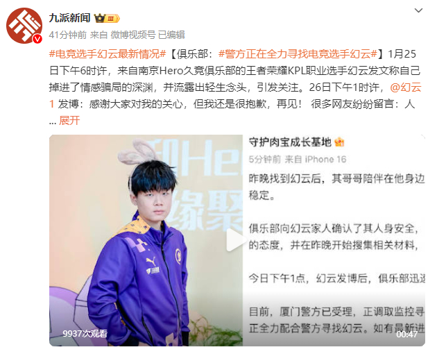 [俱乐部:警方正在全力寻找电竞选手幻云]1月25日下午6时许,来自南京Hero久竞俱乐部的王者荣耀KPL职业选手幻云发文称自己掉进了情感骗局的深渊,并流露出轻生念头,引发关注。