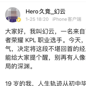 1月25日下午6点多,来自南京Hero久竞俱乐部的王者荣耀KPL职业选手幻云发文称自己掉进了情感骗局的深渊,并流露出轻生念头,引发关注。