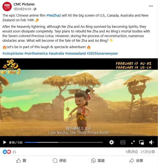 1月30日,据华语电影海外发行平台华人影业在脸书平台发布的消息,电影《哪吒之魔童闹海》(《哪吒2》)将于2月14日在美国、加拿大等地正式上映。
