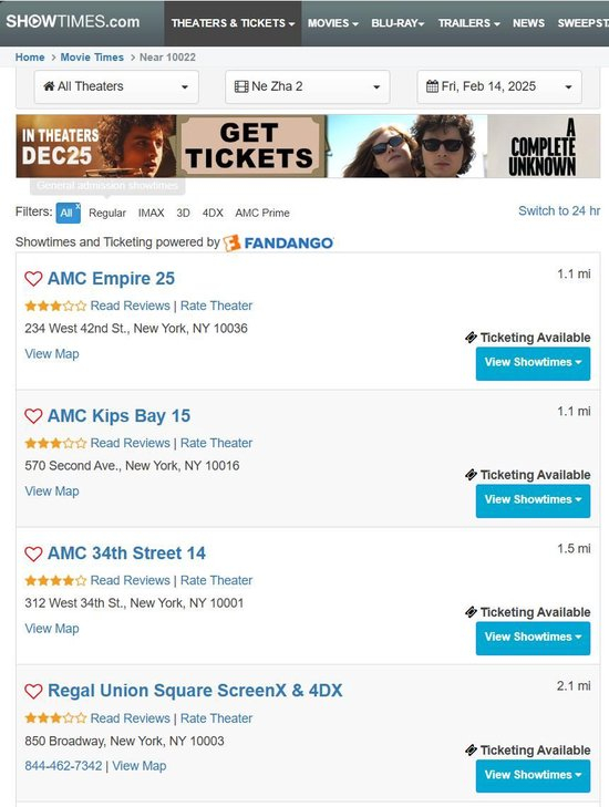 目前,在Showtimes等票务网站上仍能找到与《哪吒2》相关的售票信息。