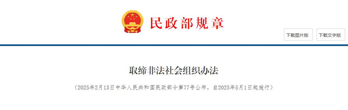 民政部发布《取缔非法社会组织办法》 2025年5月1日起施行